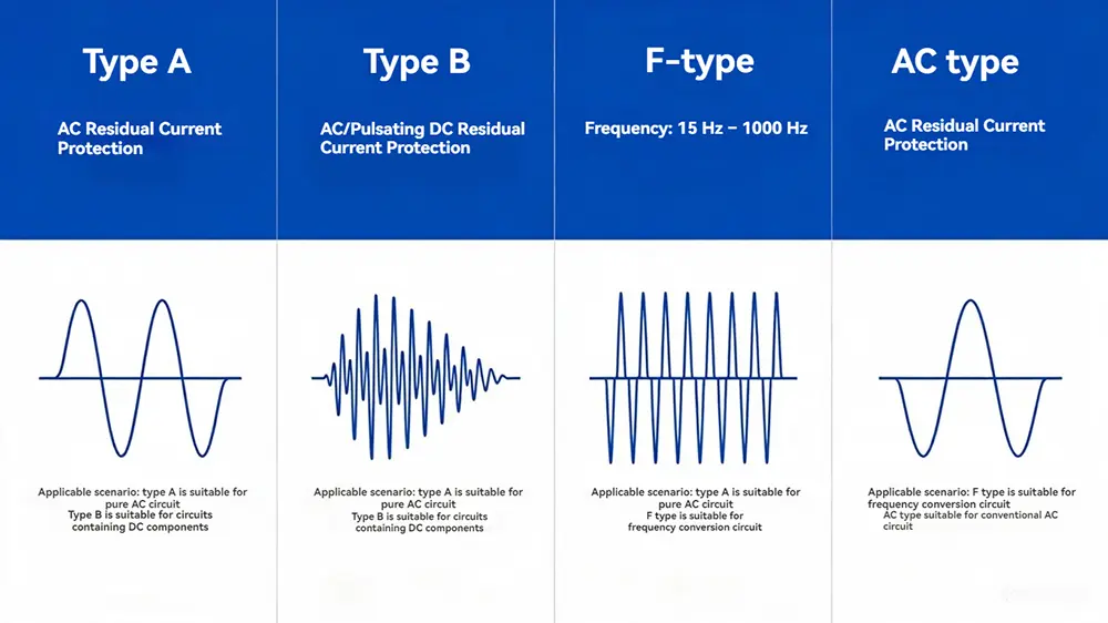 Жилищни/потребителски: Дайте приоритет на 2P/1P+N, тип AC или тип A, мигновен тип, RCBO